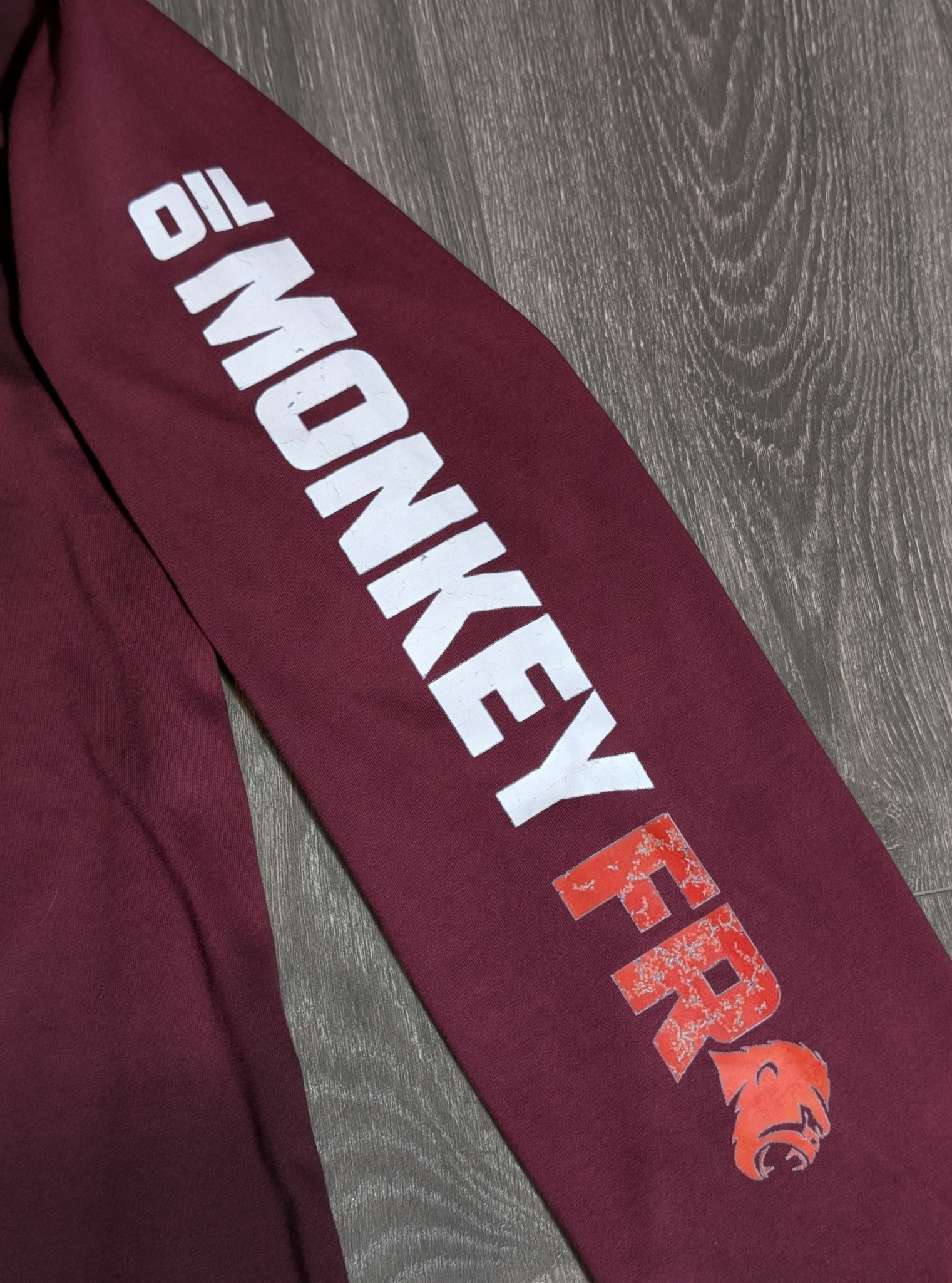 Sleeve print: OIL MONKEY FR with rugged, distressed lettering and gorilla head detail.