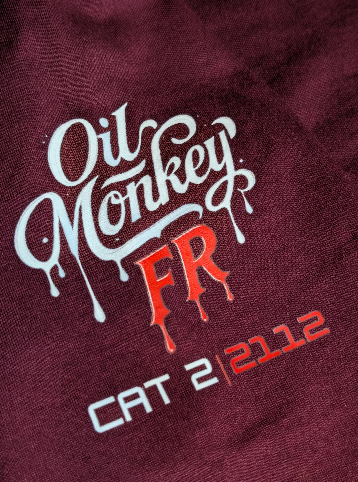 Chest print with Oil Monkey FR 2112 dripping logo for extra detail.